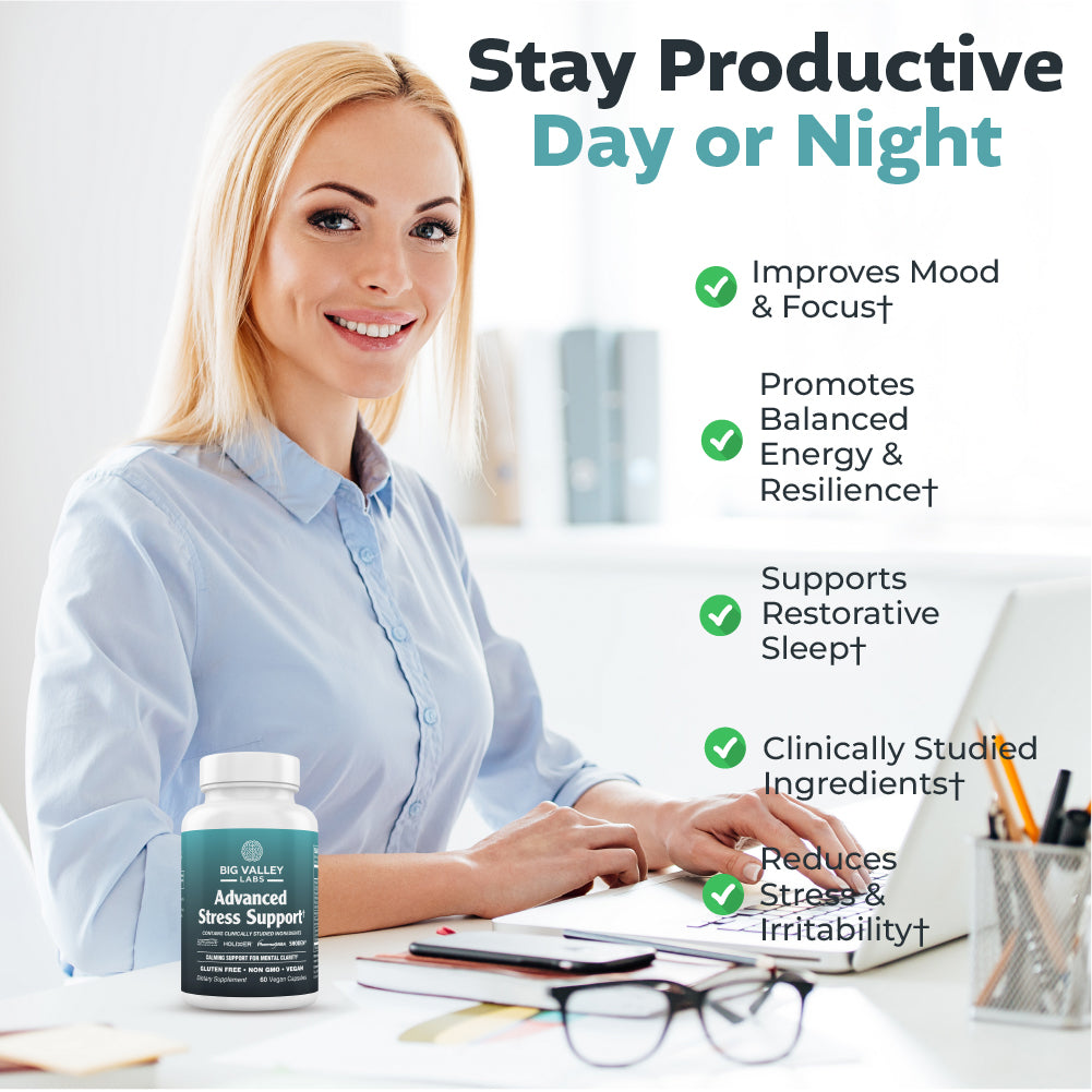 Stay Calm, Clear, and Focused Stress affects millions of Americans every day, from work pressure to life’s constant demands. Advanced Stress Support by Big Valley Labs provides a clinically backed, natural solution to help you manage stress, support mental clarity, and maintain resilience — all without drowsiness.